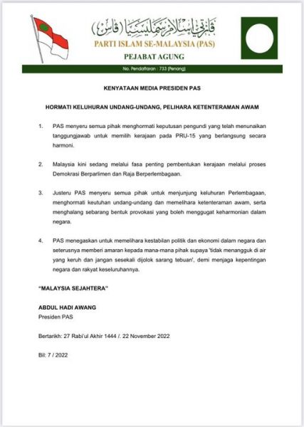 也是国盟署理主席的哈迪阿旺在文告中呼吁各造尊重选民在第15届全国大选所做出的决定。