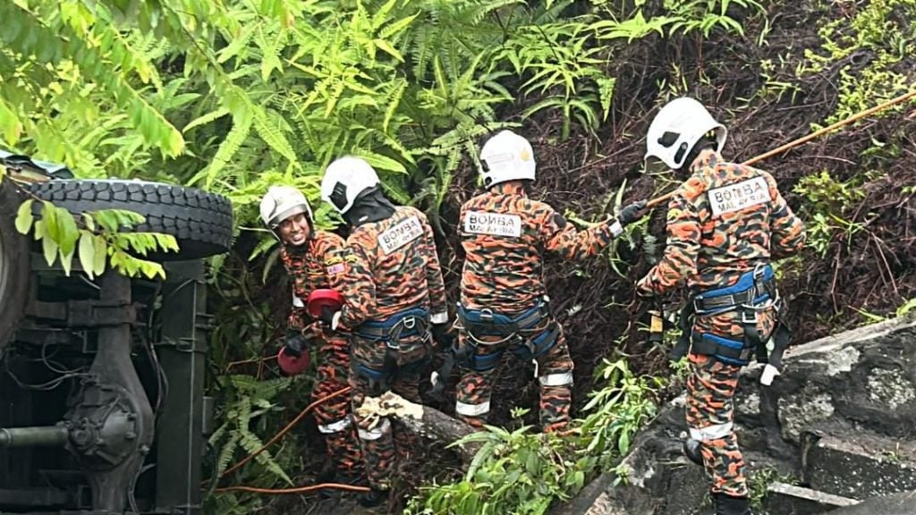 今午在南北大道靠近美诺拉隧道处翻落山沟的军人卡车,疑是在行驶中失控酿祸。