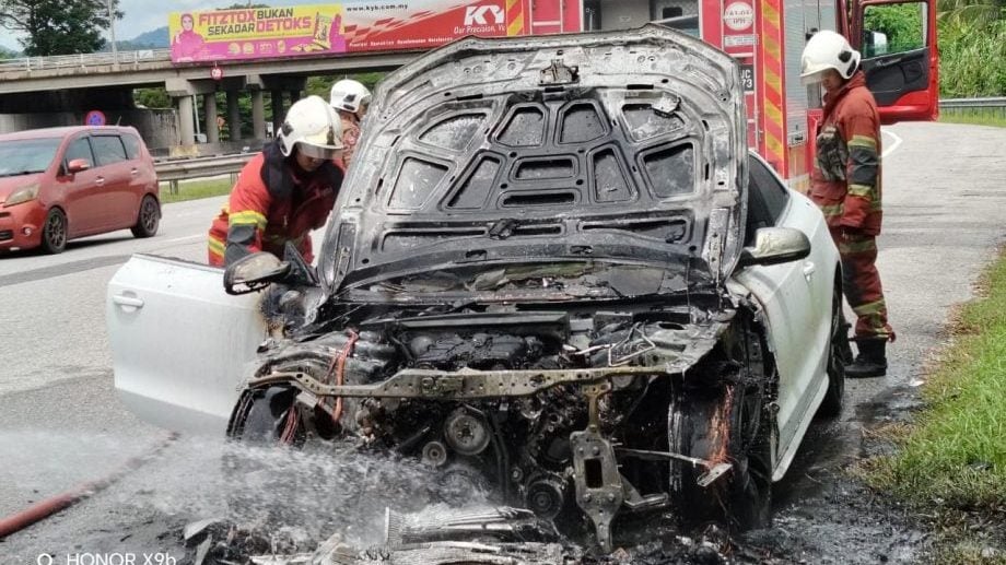 一辆豪华轿车今早在巴占南北大道出口处突发火患,火势迅速蔓延,导致车头约七成被烧毁,所幸未造成人命伤亡。