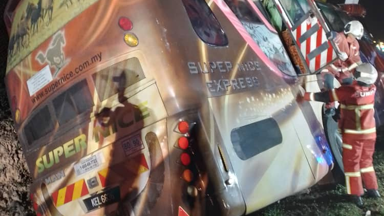 一辆载着19名乘客的长途巴士在南北大道行驶途中,疑因失控猛撞路旁告示牌铁柱后侧翻路边,造成一名华裔男子被夹困在座位上,严重当场身亡。