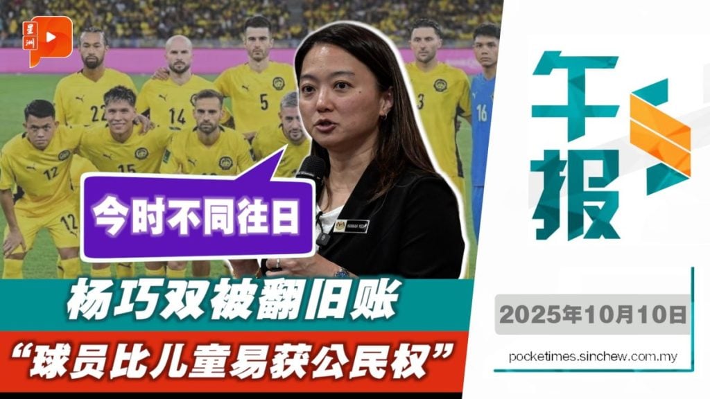 7名归化球员问题掀起千层浪,青体部长杨巧双被翻出旧帖“归化球员比无国籍儿童更易获公民权?”杨巧双火速发文回应,强调今时不同往日,政府优先保障儿童权益…… 新闻重点 👉安华4PM提呈2026财政预算案 👉玛丝艾米雅蒂“穷追不舍” 当面要求张庆信道歉 👉黄顺舸护航张庆信 斥阿克马“找错下手对象” 👉北海行李箱藏尸案 死者是失踪保险员李文瀚 👉杨巧双:无国籍儿童已大改善 不应与归化球员相提并论 👉卫部:教育机构 流感病例增 👉误信假警官 老翁遭电诈骗走600万 👉限速器执法行动检查448辆巴士 仅57辆出示证书 👉午夜长巴撞飞多头牛 这条高风险路段再引关注
