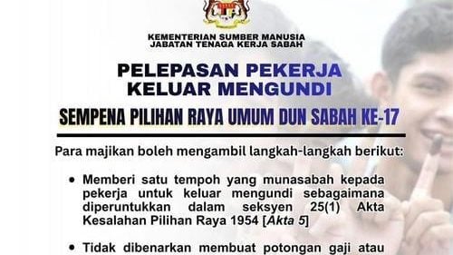 (亚庇24日讯)沙巴劳工局今日提醒州内雇主,不得以任何理由阻止雇员在11月29日的投票日履行公民权利进行投票。