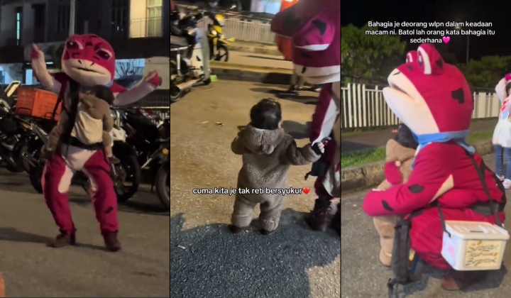 父爱动人!一名男子在夜市身穿粉红色青蛙布偶装,为民众带来欢乐表演的同时,怀中还抱着小孩。